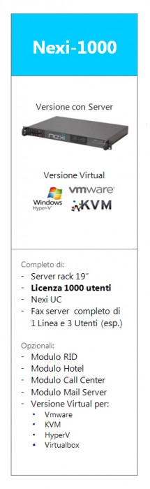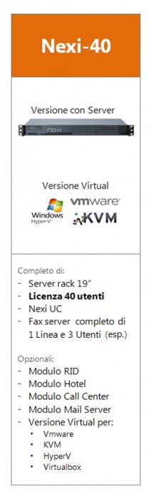 STORIALa sua essenza è nel nome. Dal latino Nexi indica il «collegare insieme, connettere, concatenare, congiungere» Nasce nel 2009 come piattaforma di comunicazione solida e flessibile ideale per migrare i pbx esistenti sul mondo IP grazie all’idea di un importante e primario system integrator italiano che trasferisce l’esperienza maturata su oltre 1500 impianti telefonici dai 5 ai 1500 sul progetto Nexi, oggi in grado di interconnettere ogni device o applicazione basata su protocollo SIP. Nel 2013 Nexi, grazie alla volontà di Nextmedia, azienda sempre attenta al mercato e ai prodotti ad alto contenuto tecnologico, ha ricevuto un forte impulso nello sviluppo di servizi ad hoc per i propri partner. Conservando lo spirito iniziale, Nexi è ora ottimizzato sia per lavorare come «ponte» verso sistemi esistenti che in completa autonomia, con una serie di funzionalità e plus che lo rendono fortemente concorrenziale sul mercato italiano e non solo. Il team Nexi è formato da persone giovani e determinate a sviluppare sempre più la piattaforma anche grazie al prezioso supporto di tutti i partner che contribuiscono con idee e suggerimenti. PRODOTTINexi è un sistema basato su piattaforma Open Source in continua evoluzione grazie al contributo di una attivissima community. Oltre alle funzioni base, gestisce funzionalità avanzate che centralini tradizionali spesso non supportano o che richiederebbero importanti investimenti per l’implementazione. Nexi è attivabile sia su hardware ottimizzato per Asterisk che su macchine virtuali.